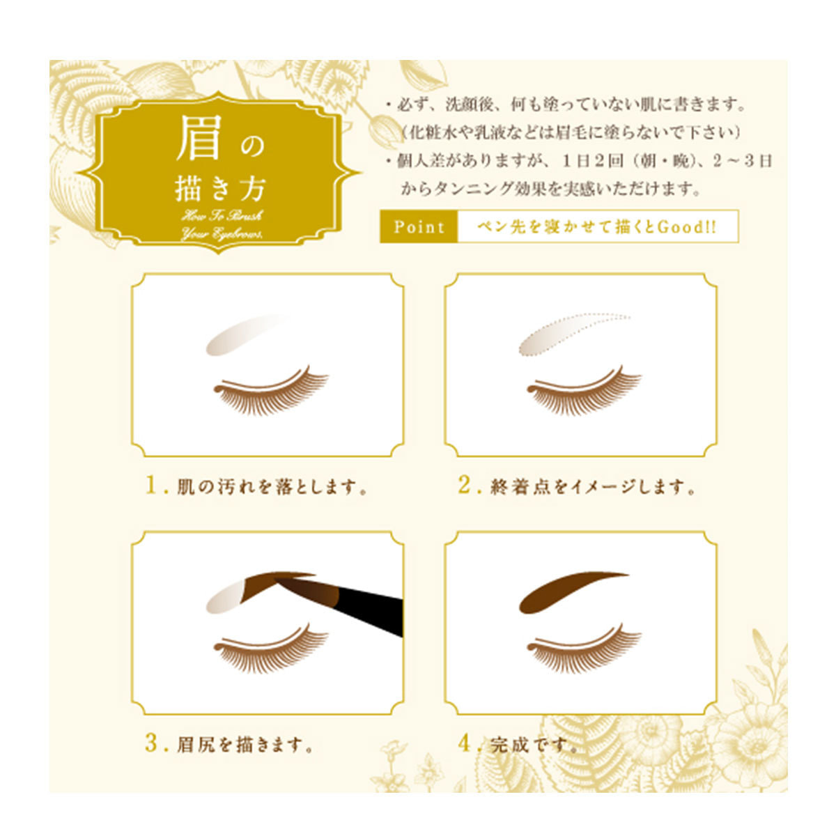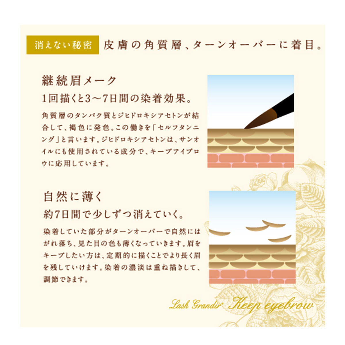 セルフタンニング成分が角質層に染着して、メークを落としても眉ラインをしっかりキープさせます。